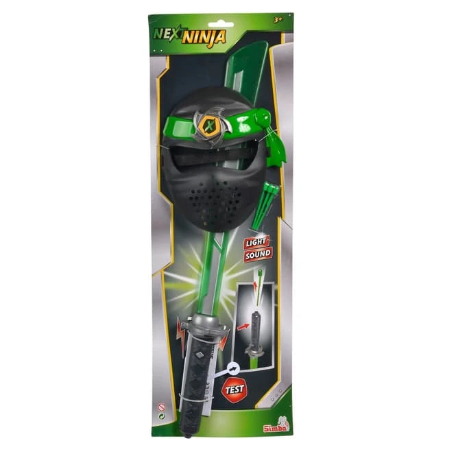 Mit dem Set bestehend aus Next Ninja Schwert und der Maske können Kinder in die Rolle eines echten Ninjas schlüpfen. Das ca. 60cm große Schwert verfügt über Licht und besitzt eine Schussfunktion. Drückt man auf den Knopf am Griff, so werden die Pfeile aus dem Griff geschossen. Die Maske wird mit einem Textilband am Kopf besfestigt. Das Next Ninja Schwert und die Maske von Simba Toys sind für Kinder ab 3 Jahren geeignet.